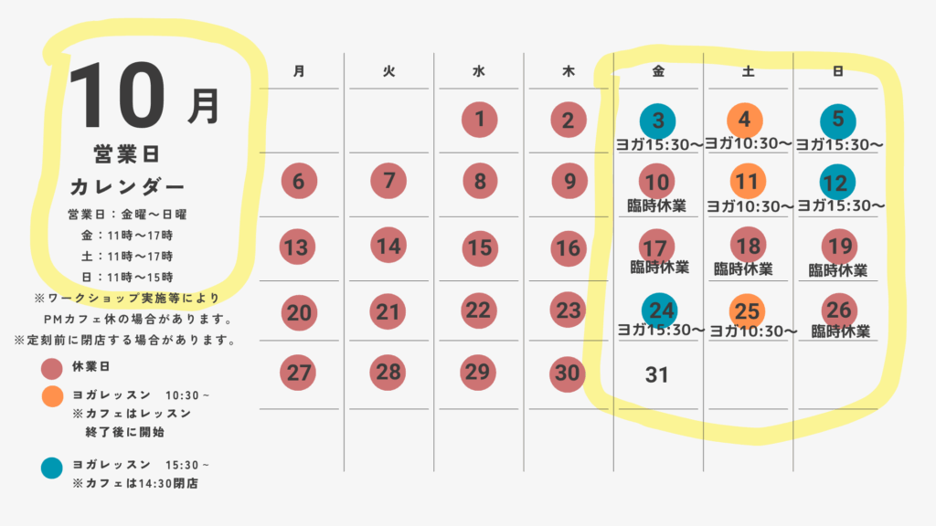 ※10/10,10/17~10/19,10/26は臨時休業となります。